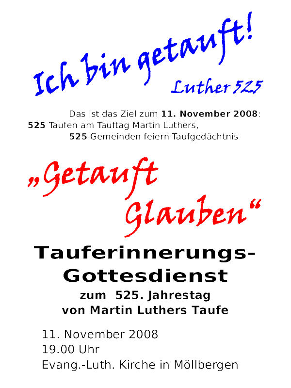 Auch die Kirchengemeinde Holzhausen und Holtrup an der Porta nimmt mit ihrem Gemeindebezirk Möllbergen an der Aktion zum 525. Tauftag von Martin Luther teil. Unter der Überschrift "Getauft glauben" wird natürlich die Taufe im Mittelpunkt stehen, aber auch das, was die Möllberger Konfis sich an eigenen Gedanken zum Glauben und zum Glaubensbekenntnis gemacht haben.