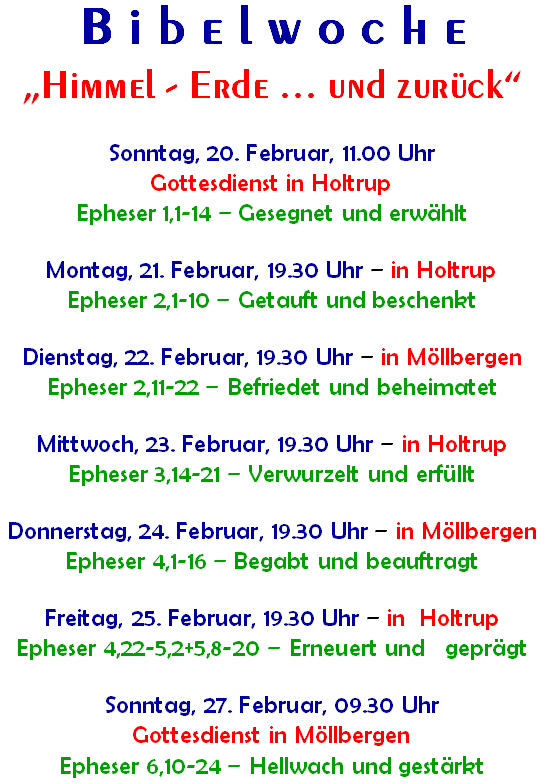 Für unsere Gemeindebezirke Möllbergen und Holtrup-Vennebeck ist es darüber hinaus ein besonderer Sonntag, weil mit dem Gottesdienst die diesjährige Bibelwoche eröffent wird.