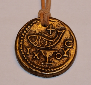 Es ist ein Anhänger, der einer alten, antiken Münze nachgebildet ist: der Anhänger ist aus Metall auf der Vorderseite sind verschiedene Dinge zu erkennen: ein Kreuz, ein Kelch, eine Reihe von Punkten oder Perlen, ein Fisch und schließlich eine Reihe von fünf Buchstaben: Diese Buchstaben sind zwar in griechischer Schrift, aber mit dem Fisch als Erinnerung werdet ihr Euch ganz schnell erinnern, dass es sich um dieses Minibekenntnis aus den Buchstaben des griechischen Wortes für Fisch handelt: Ichtus. Jeder Buchstabe des Wortes ist der Anfangsbuchstabe für insgesamt fünf einzelne Worte: Ichtus aufgefächert heißt dann „Jesus Christus, Theou Huios Soter“ und es bedeutet: „Jesus Christus Gottes Sohn, der Retter.“