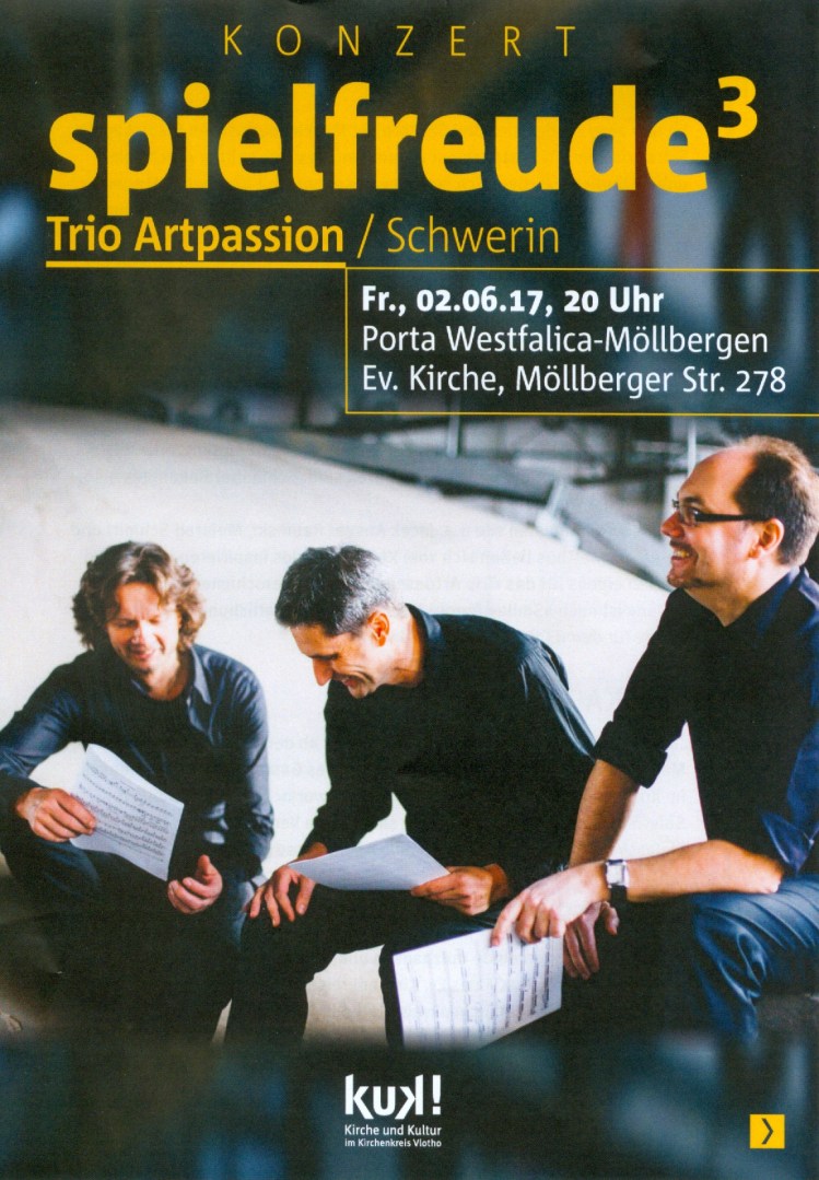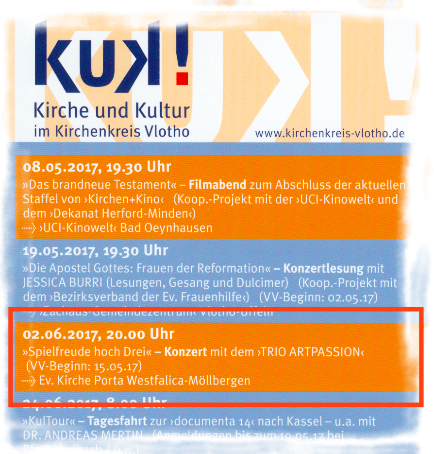 • Schon einmal zum Vormerken: am 2. Juni gibt es mit dem  Trio Artpassion in der Möllberger Kirche ein besonderes Konzert! Eine faszinierende musikalische Mischung mit Klarinette, Kontrabass und Marimbaphon: