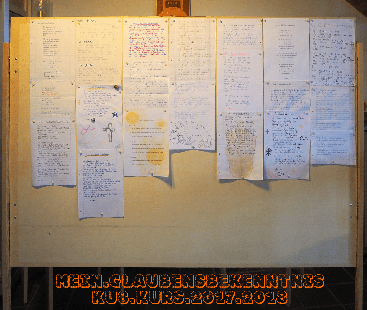 • Im Oktober haben wir im Konfirmandenunterricht über das Glaubensbekenntnis und die vielen Möglichkeiten, seinen Glauben zu bekennen, gesprochen. Als Hausaufgabe sollten die Konfis ihr eigenes Glaubensbekenntnis schreiben. Neben dem „normalen“ Apostolischen Glaubensbekenntnis gab es zur Anregung verschiedene andere Bekenntnisse: das „Ich glaube“ von Dietrich Bonhoeffer, das Bekenntnis unserer Partnerkirche UCC und manches mehr. Insgesamt sind ganz tolle Texte herausgekommen, die zur Zeit in der Möllberger Kirche als große „Glaubenswand“ zu sehen sind. Herzliche Einladung, sich das einmal anzusehen. Das Bild zeigt die Texte in der Möllberger Kirche.