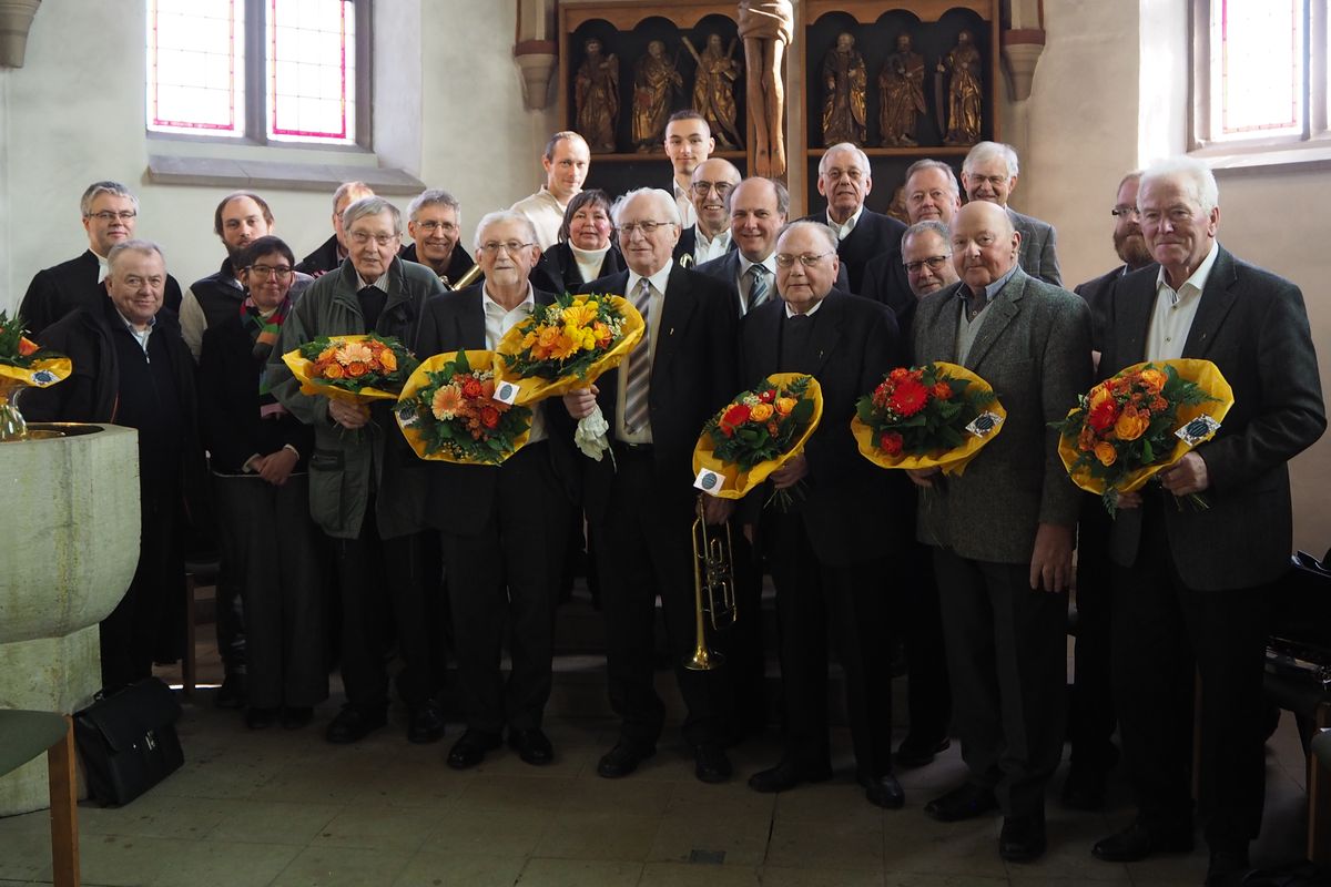 Im Rahmen dieses Gottesdienstes konnte mehrere Mitglieder für langjährige Dienste im Chor geehrt werden – allen voran Heinz Klocke, der seit über 70 Jahren dabei ist. Daneben gehörten Friedbert Geile (55 Jahre), Friedel Kühme (60 Jahre), Willi Heuke (65 Jahre), Heinrich Hostmann (65 Jahre) und Helmut Kütemeier (65 Jahre) zu den Jubilaren. Pfarrerin Renate Wefers überbrachte in ihrem Grußwort die Glückwünsche der Kirchengemeinde Uffeln, mit der der Posaunenchor traditionell sehr eng verbunden ist.