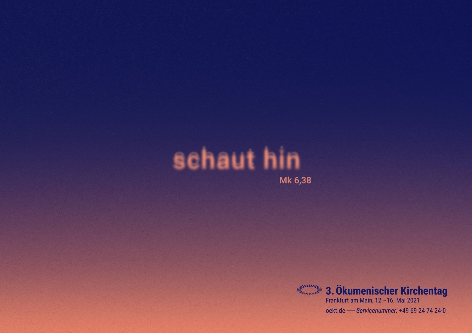 Der 3. Ökumenische Kirchentag in Frankfurt hat ein Gesicht: Das neue Kampagnenmotiv wurde von Bettina Limperg und Prof. Dr. Thomas Sternberg, Präsidentin und Präsident des ÖKT, und Benjamin Schwarz von der Berliner Agentur part vorgestellt. Im Mittelpunkt des Bildes steht das Leitwort des ÖKT „schaut hin“ (MK 6,38), das bewusst unscharf gestaltet wurde. Den Hintergrund bilden die Farben Dunkelblau und Peach.