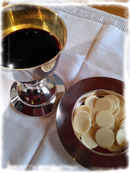 Wie beim Abendmahl in der Kirche sind auch ein paar Vorbereitungen hilfreich, damit alles gut klappt. Was normalerweise die Küsterin in der Kirche tut, ist nun Aufgabe von Dir/Ihnen: Bereiten Sie/bereite(t) den Tisch vor. Eine Tischdecke und eine Kerze, ein Kreuz und vielleicht ein paar Blumen; für das Abendmahl etwas geschnittenes Brot und einen Becher (oder mehrere) mit Traubensaft oder Wein.