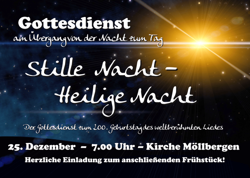 Der Gottesdienst, den wir mit besonderer Liturgie in der illuminierten Möllberger Kirche feiern, beginnt um 7.00 Uhr. Anschließend ist Frühstück im Gemeindehaus.